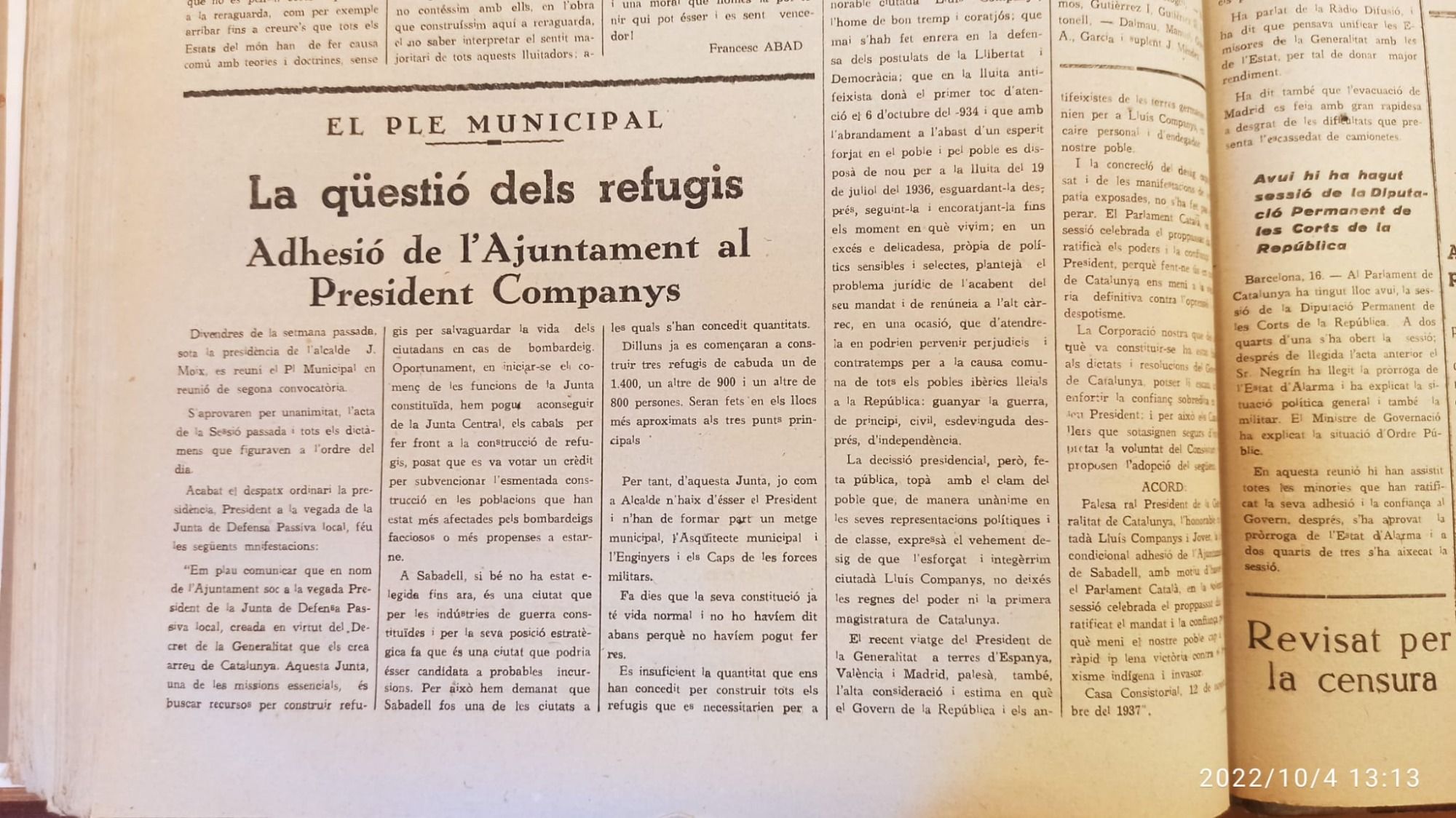 Va ser en aquesta publicació del dimarts 16 de novembre del 1937 on s'informa que s'ha constituït la comissió de defensa passiva de la ciutat sota l'alcaldia de Moix i, que el dilluns passat s'havia ordenat la construcció de TRES refugis, és a dir, que el dilluns 15 de novembre del 1937 podem dir que es va començar a construir els tres refugis de la ciutat (un d'ells, el del Pau Vila).