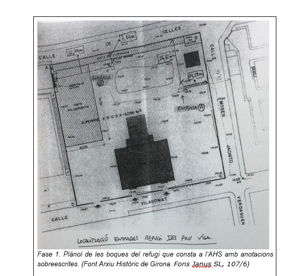 A la fase 1 es superposà un plànol de les boques del refugi que consta a l’AHS (un plànol d’arquitecte de la finca amb cotes a la precisió dels centimetres) sobre un plànol del Pau Vila del Departament d’Ensenyament (actualment Departament d’Educació) i es va trobar que hi havia una entrada del refugi sota el gimnàs masculí i una altra sota l’edifici gran. També es mencionà que s’estava pendent de la prospecció geofísica i que les cales del sondeig tinguessin una superfície aproximada de 5 . Incomprensiblement, els tècnics del MHS, que són qui van assumir aquesta tasca de juxtaposició, van ocultar el plànol inicial i els resultats de la ubicació de les entrades del refugi tant a la comunitat educativa de l’Institut Pau Vila com a l’empresa que havia de realitzar els treballs de les fases 2 i 3. Això va repercutir negativament a la prospecció arqueològica puix que, a efectes pràctics, fou com si no s’hagués realitzat el treball d’aquesta fase, ja que tampoc s’esmentà ni en la memòria final ni en un document de correccions creat a posteriori.